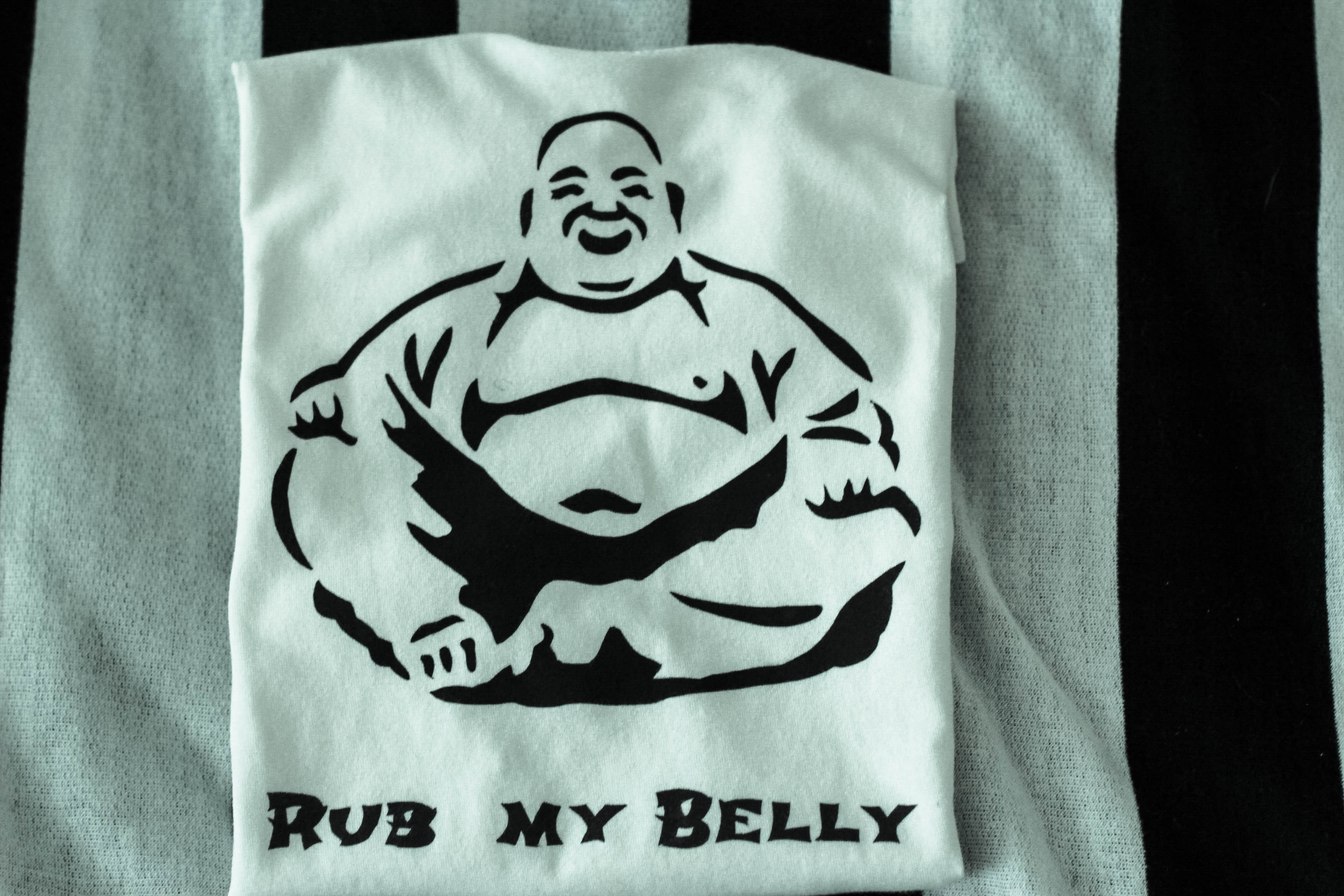 Rub My Belly For Good Luck. Our New Buddha Cotton T-Shirt Design is also available on a onesie.
